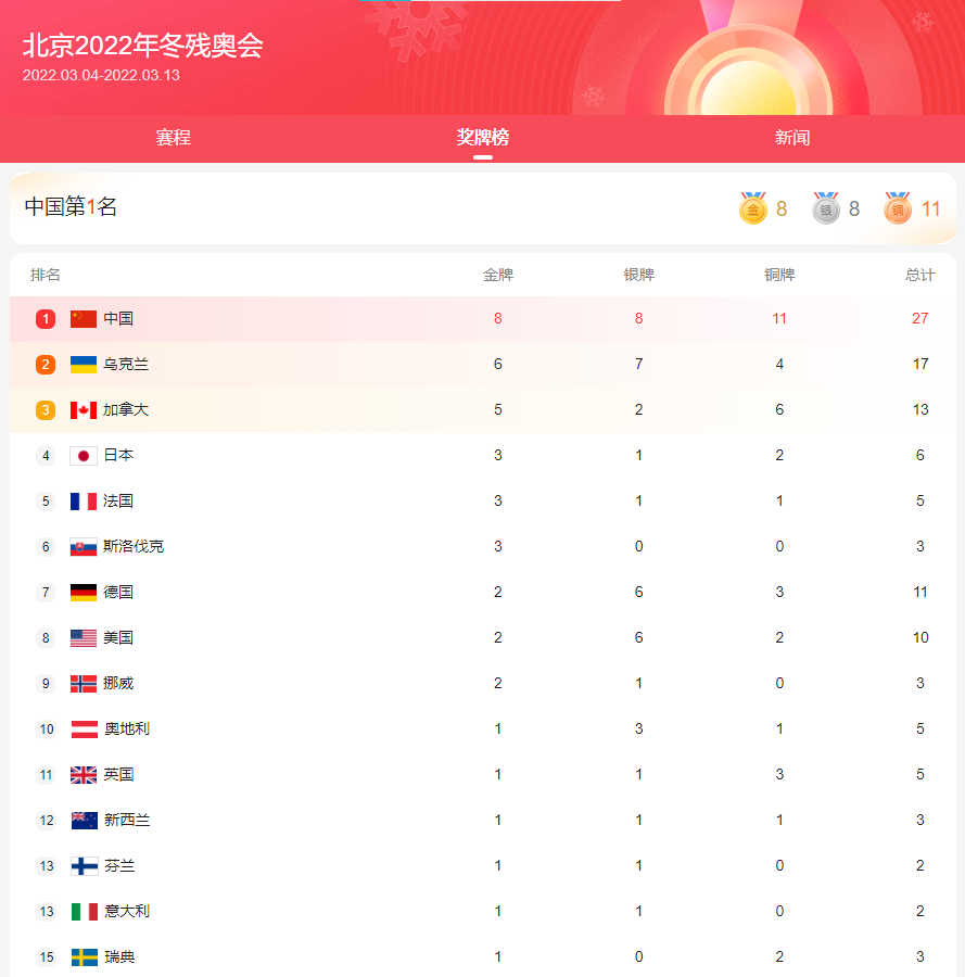 冬残奥会220309 2022年3月8日 21:43:53Jerry Jerry 管理员 关注 67文章 0粉丝 未分类评论27阅读模式 冬残奥会奖牌榜(剩余5个比赛日争夺36枚金牌) 1、冬季两项男子短距离坐姿比赛中,刘子旭获得金牌 2、冬季两项女子6公里(站姿组)比赛中,开幕式中国代表团旗手郭雨洁夺得金牌 3、高山滑雪女子超级大回转(站姿组)比赛中,张梦秋夺得金牌 4、越野滑雪男子长距离坐姿组比赛金银牌 5、杨洪琼摘得残奥越野滑雪女子长距离(坐姿)金牌 6、梁景怡夺得高山滑雪男子超级大回转(站姿组)金牌 7、纪立家、王鹏耀、朱永钢分别将金银铜牌收入囊中 8、刘梦涛冬季两项男子中距离(坐姿)夺金 文章末尾固定信息 中国地理——七个地区和四个直辖市-220401 天气播报-220330 东航MU5735航空器飞行事故-220325 地理基础知识-220324 点赞 https://www.jisirui.com/73/ 复制链接 复制链接
